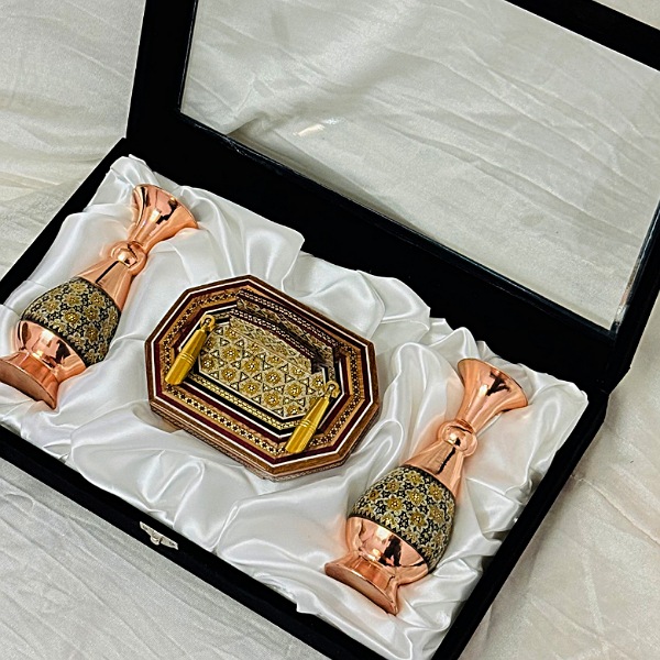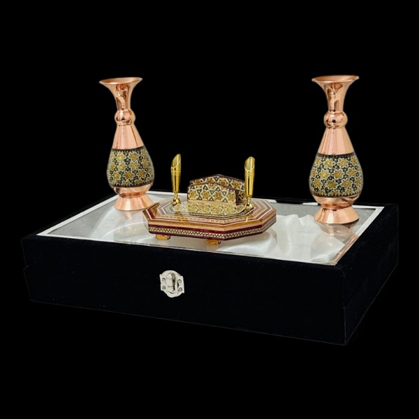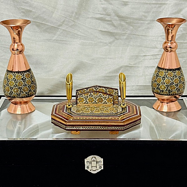 ست هدیه اداری خاتمکاری شامل دو عدد گلدان مس و خاتم با ارتفاع ۱۶ سانت و یک جاخودکاری خورشیدی به ابعاد ۱۱×۱۵ سانتیمتر. این مجموعه با روکش نانو پلیاستر جهت تثبیت رنگ و افزایش دوام ساخته شده و در جعبه مخملی شیشهای هدیهای ارائه میشود. انتخابی شیک و نفیس برای مدیران و هدایای سازمانی.