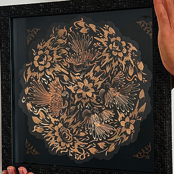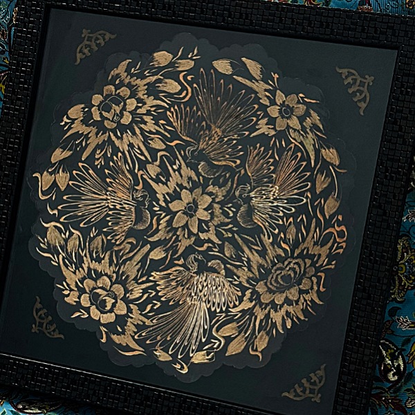 طراحی این تابلو بسیار ظریف و چشمنواز است. لبههای دالبریشکل بشقاب، جلوهای هنری به اثر بخشیده و در مرکز آن، یک گل ششپر به همراه چهار سیمرغ بهصورت برجسته کار شدهاند که نمادی از فرهنگ و هنر اصیل ایرانی هستند.