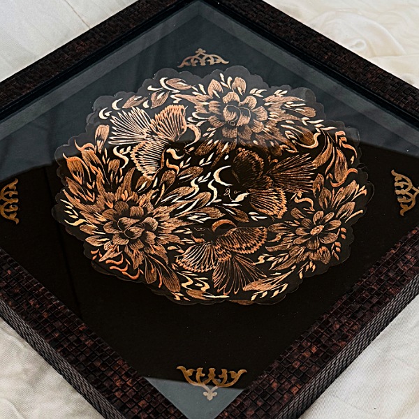 Lتابلو بشقاب مسی الماستراش با قطر ۲۵ سانتیمتر، یکی از آثار نفیس و دستساز برند خاتون آرت است که درون قاب مقاومی از جنس PVC با ابعاد ۳۰×۳۰ سانتیمتر قرار گرفته است. این قاب علاوه بر افزایش جلوه بصری، حملونقل آسانتری را فراهم کرده و بهعنوان محافظی مؤثر در برابر گرد و غبار و آسیبهای احتمالی عمل میکند.