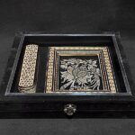 این ست نفیس شامل قلمدان خاتمکاری با طول ۲۰ سانت و تابلو قلمزنی به ابعاد ۱۸×۲۳ سانتیمتر بوده که با ترکیب چوب، مس و خاتم، جلوهای ماندگار از هنر اصیل ایرانی را به نمایش میگذارد. پوشش نانو پلیاستر جهت تثبیت رنگ و دوام بیشتر به کار رفته است. مناسب برای هدیه، دکور فضاهای رسمی و سنتی، و انتخابی خاص برای دوستداران هنر اصفهان.