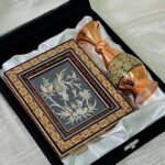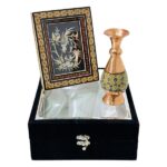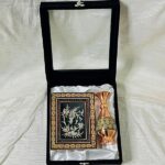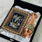 ست هدیه نفیس خاتم کاری شامل دو عدد گلدان مس و خاتم با ارتفاع ۱۶ سانتیمتر و تابلوی قلمزنی زیبا به ابعاد ۱۸×۲۳ سانتیمتر. این پک شیک و هنری با روکش نانو پلیاستر برای تثبیت رنگ و افزایش ماندگاری تهیه شده است. بستهبندی محصول در جعبه مخملی هدیهای با درب شیشهای ارائه میشود.